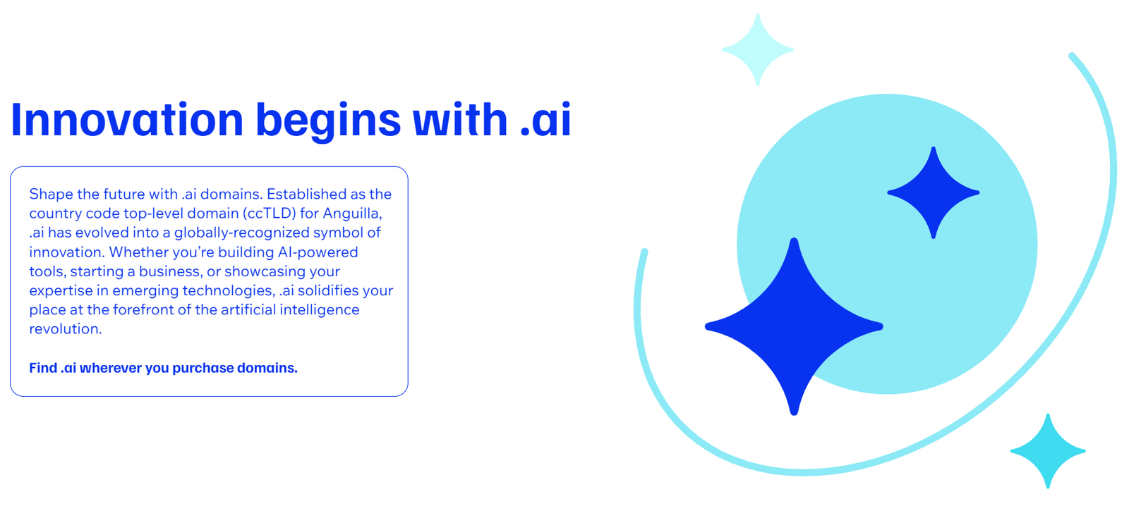 .ai 是分配给安圭拉的国家代码顶级域名 (ccTLD)。该域名于 1995 年推出,现已被广泛用作人工智能 (AI) 相关公司和项目的域名 hack。注册局支持 DNSSEC,全球注册人均可获取 .ai 域名